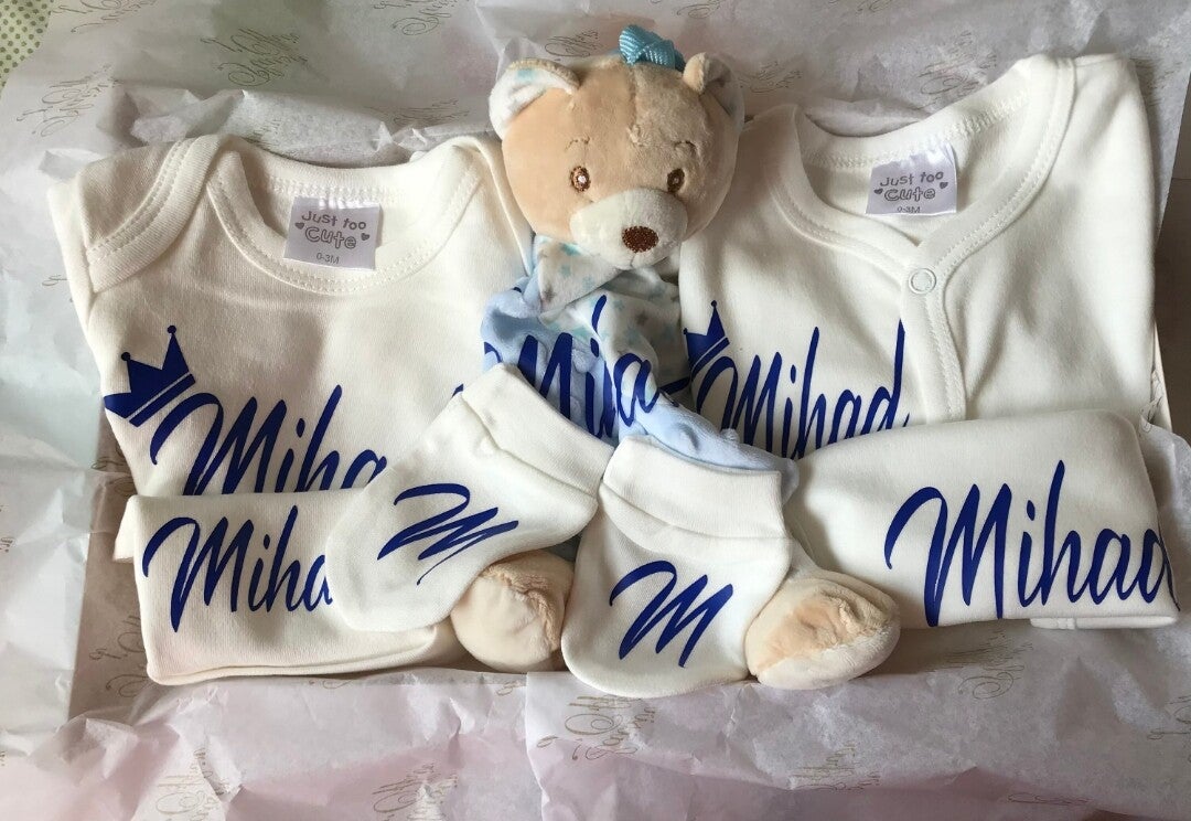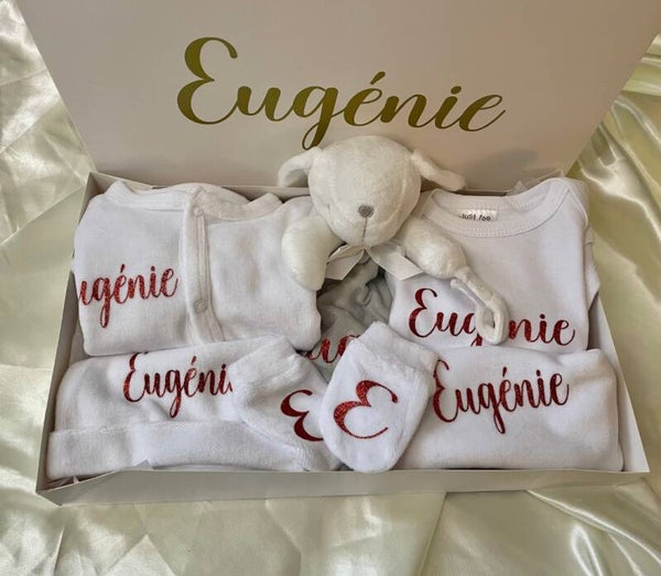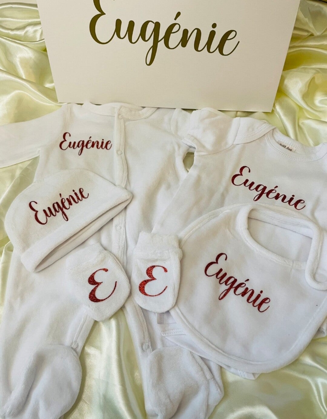 Coffret de naissance personnalisé – Pyjama, bonnet, gants et chaussettes